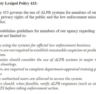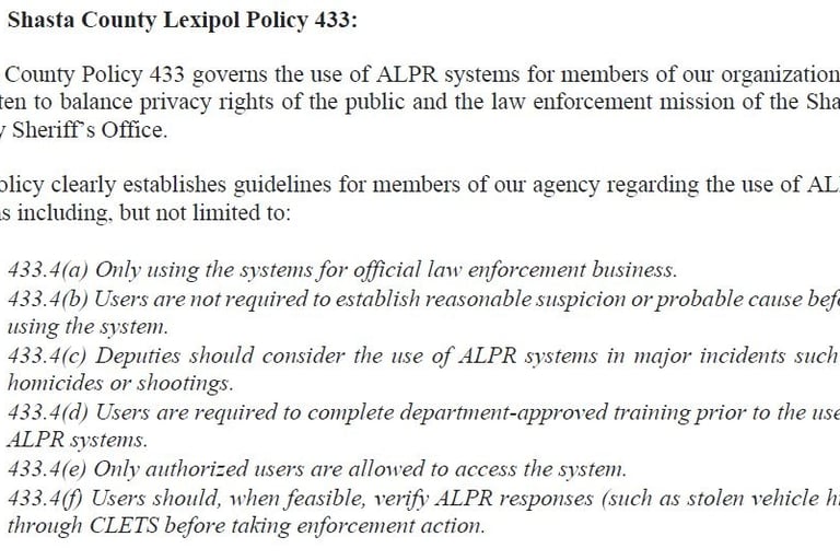 You'll notice in the Shasta Co. Sheriff policy section (b), where neither reasonable suspicion nor probable cause is required to use the ALPR system!